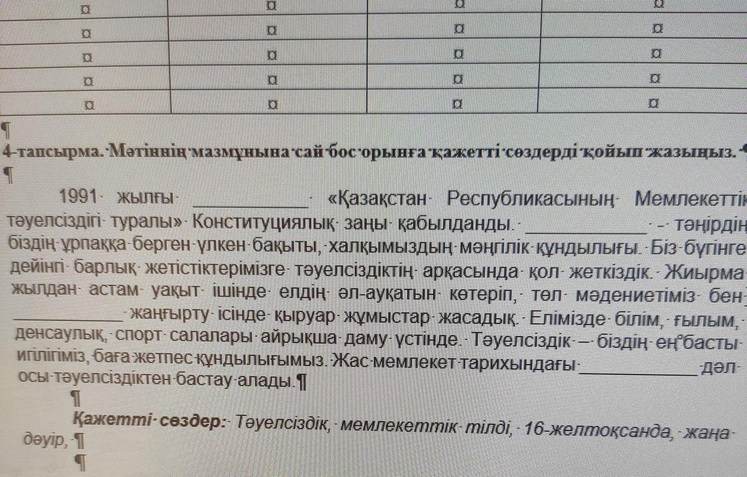 а НА 4-тапсырма. Мәтіннің мазмұнына сай бос орынға қажетті сөздерді қойып жазыңыз. - П 1991 жылғы- «Қазақстан Республикасының Мемлекеттік тәуелсіздігі туралы» Конституциялық заңы қабылданды. тәңірдің біздің ұрпаққа берген үлкен бақыты, халқымыздың мәңгілік құндылығы. Біз бүгінге дейінгі барлық жетістіктерімізге тәуелсіздіктің арқасында қол жеткіздік. Жиырма Жылдан астам уақыт ішінде елдің әл-ауқатын: көтеріп, төл мәдениетіміз бен жаңғырту ісінде қыруар жұмыстар жасадық. Елімізде білім, ҒЫЛЫМ, денсаулық, спорт салалары айрықша-даму үстінде. Тәуелсіздік – біздің ең"басты- игілігіміз, баға жетпес құндылығымыз. Жас мемлекет тарихындағы ДӘЛЕ ОСЫ Тәуелсіздіктен бастау алады. 1 1 Қажетті-сөздер: Тәуелсіздік, мемлекеттік тілді, - 16-желтоқсанда, жаңа дәуір, |