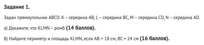 S ромб = 1/2 KM * LN = 1/2 * AD * AB = 1/2 * 24 * 18 = 216 ( см² ) ;