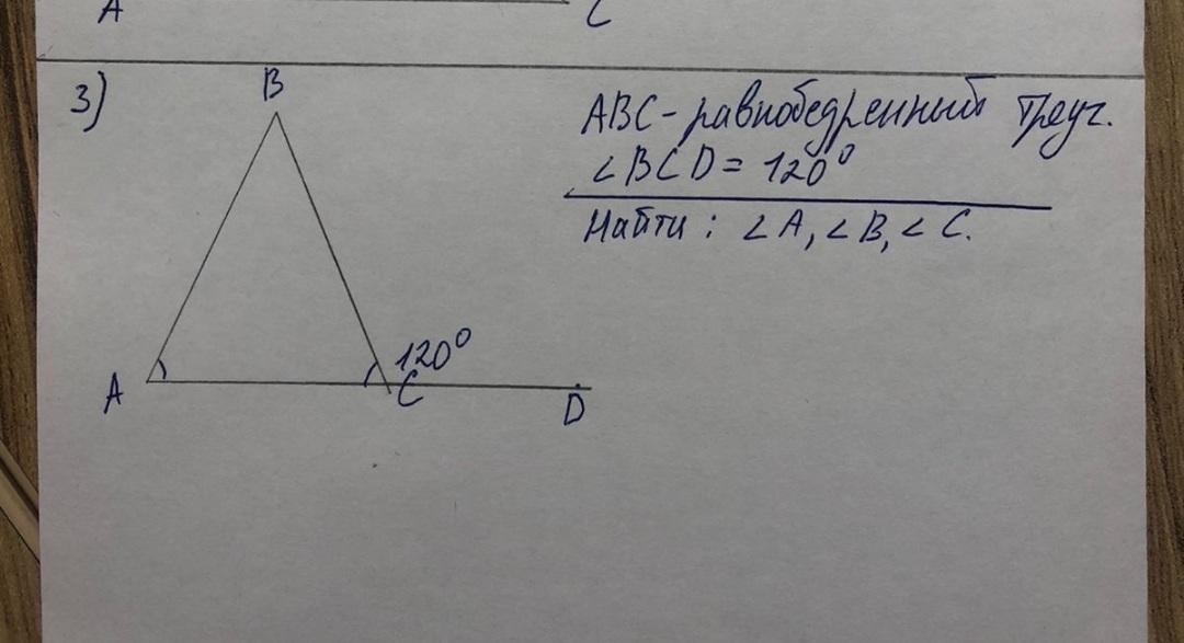 ∠A = ∠BCA = 180° - 120° = 60° ; ∠A = ∠C = 60° ( властивість