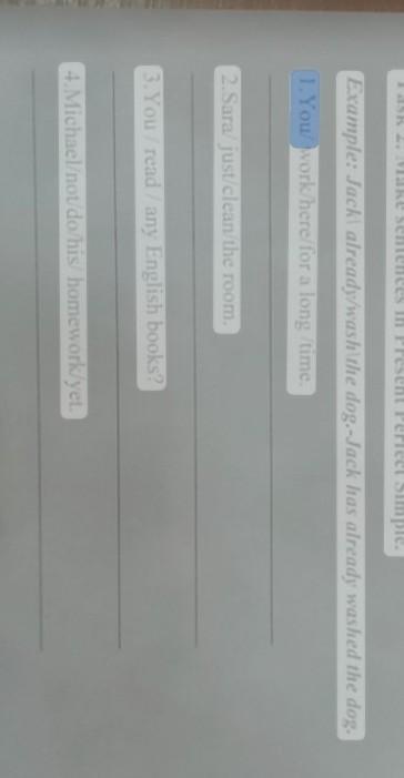 Task 2. Make sentences in Present Perfect Simple Example: Jack already was the de-Jack has already washed the ding You' work here for a long time. 2.Sara just clem the rem 3 You read any English books? 4. Michael not do his homework yet Task 3. Change the direct speech into reported speech. 1.Pete said: "I'm watching TV" 2.She said: "I will eat cheese" 3 Klara, id: "I have seen the Eiffel Tower"