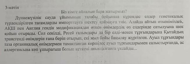 1.мәтінді оқып,онда көтерілген басты мәселені өз сөзіңізбен түсіндіріңіз.2.мәтіннен 2 факті мен 2 автордың көз қарасын білдіретін ақпаратты табыңыз және себебін түсіндіріңіз