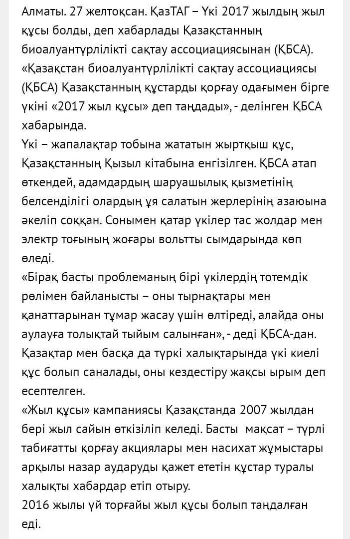 Қазақстан биоалуантүрлілікті сақтау ассоциациясы (ҚБСА) Қазақстан құстар қорғау одағымен бірге 2017 жылдың құсын таңдады. Бұл – үкі. Үкіні сипаттаңыз. Таңдау себебін түсіндіріңіз. [10]