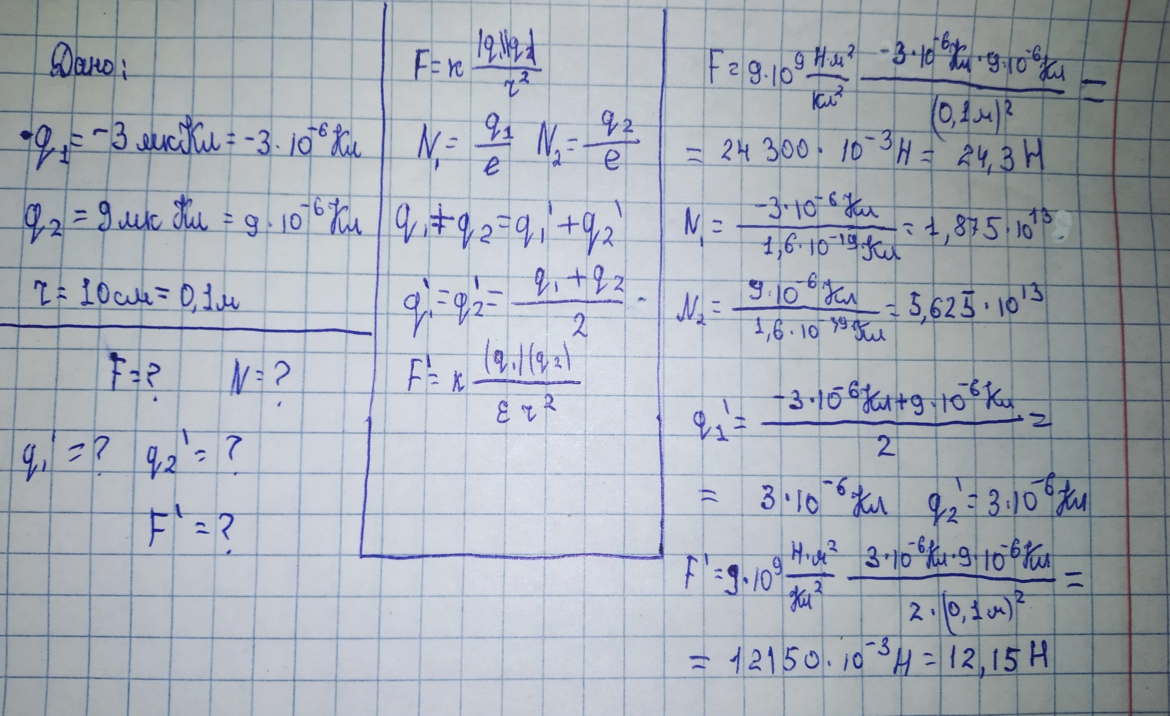 Два металлических шарика с одинаковыми зарядами -3 мкКл и 9 мкКл находятся на расстоянии 10 см друг от друга.