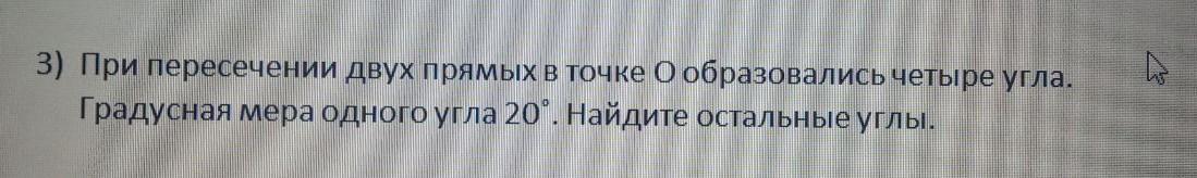 3) При пересечении двух прямых в точке о образовались четыре угла. Градусная мера одного угла 20°. Найдите остальные углы.