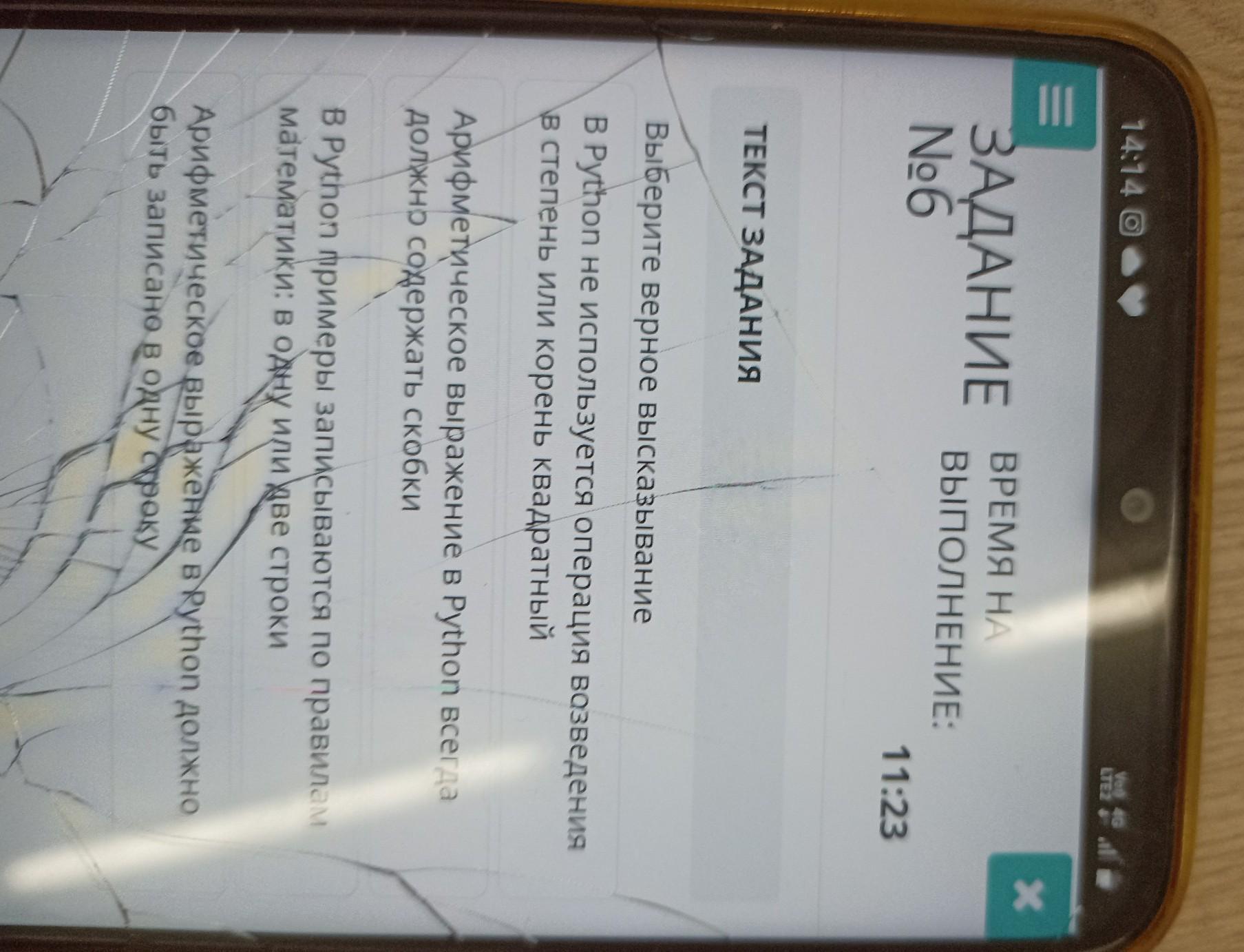 ЗАДАНИЕ No6 ИЯ НА ВЫПОЛНЕНИЕ: 12:06 ТЕКСТ ЗАДАНИЯ Выберите верное высказывание BPython не используется операция возведения е степень или корень квадратный Арифметическое выражение в Python всегда должно содержать скобки В Python примеры записываются по правилам математики: в одну или две строки Арифметическое выражение в Python должно быть записано в одну строку