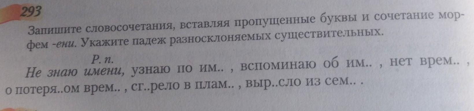 Запишите словосочетания, вставляя пропущенные буквы и сочетание мор- фем -ени. Укажите падеж разносклоняемых существительных Р. п. Не знаю имени, узнаю по им.. , вспоминаю об им.. , нет врем.. о потеря..ом врем.. , сг..рело в плам.. , выр..сло из сем...
