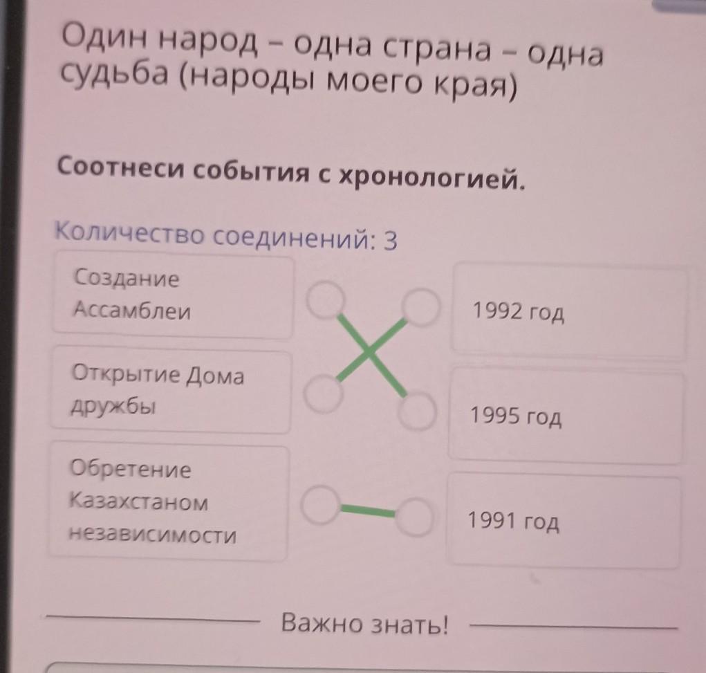 Один народ - одна страна - одна судьба (народы моего края) Соотнеси события с хронологией. Количество соединений: 3 Создание Ассамблей 1992 год Х Открытие Дома дружбы 1995 год Обретение Казахстаном 1991 год независимости