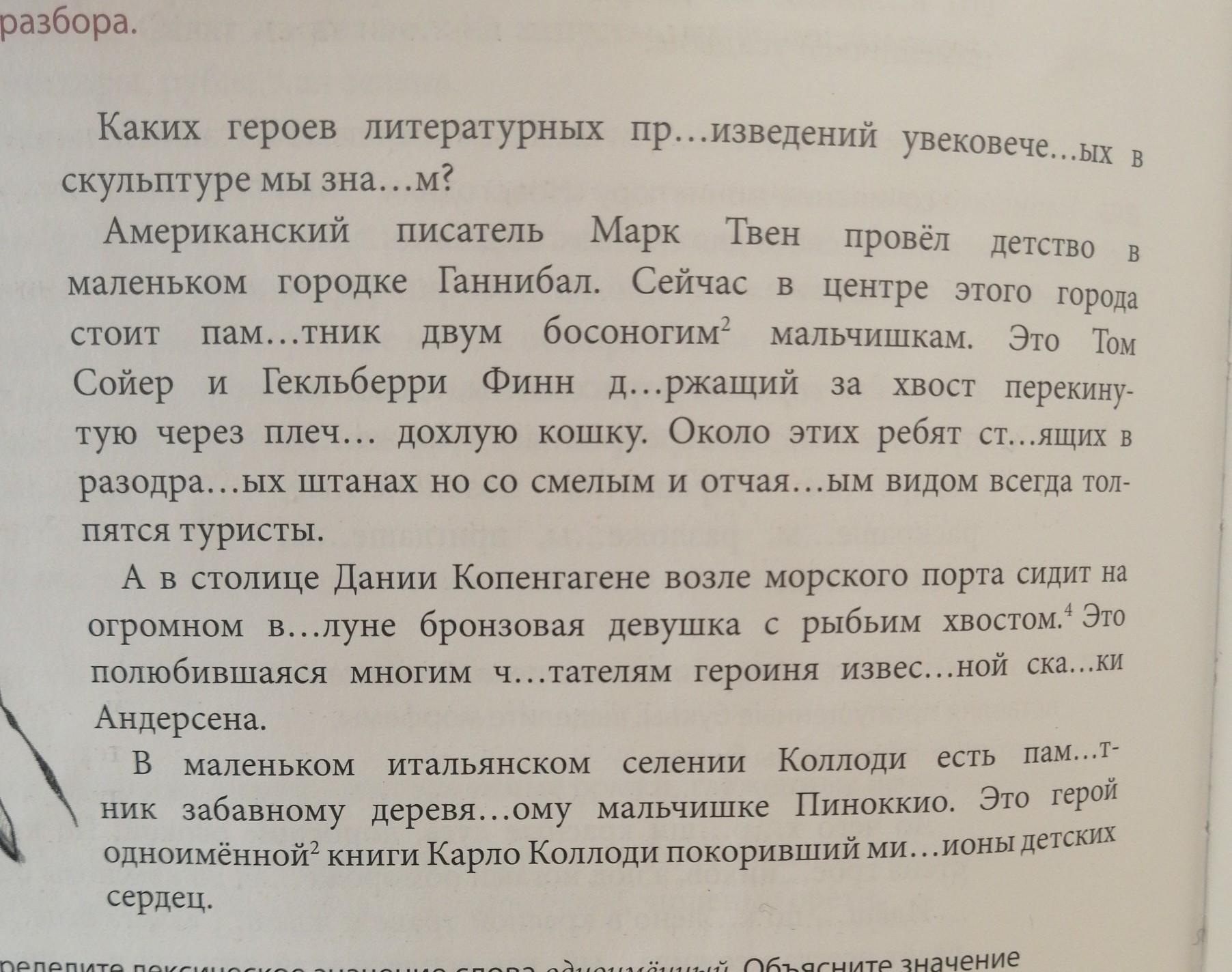 Каких героев литературных произведений, увековеченных в скульптурах, мы знаем? Американский писатель Марк Твен провел детство в городе Ганнибал. В центре этого города воздвигнут памятник двум босоногим мальчишкам. Это Том Сойер и Гекльберри Финн, держащий разодранные штаны со смелым и отчаянным видом, всегда толпятся туристы. В копенгагенском морском порту на огромных камнях сидит бронзовая девушка с рыбьим хвостом. Это полюбившаяся датчанам героиня известной сказки Андерсена "Русалочка". В маленьком селении Коллоди в Италии есть памятник забав, носу деревянному мальчишке Пиннокио. Это герой одноименной книги Карло Коллоди - деревянный человек, покоривший миллионы детских сердец.