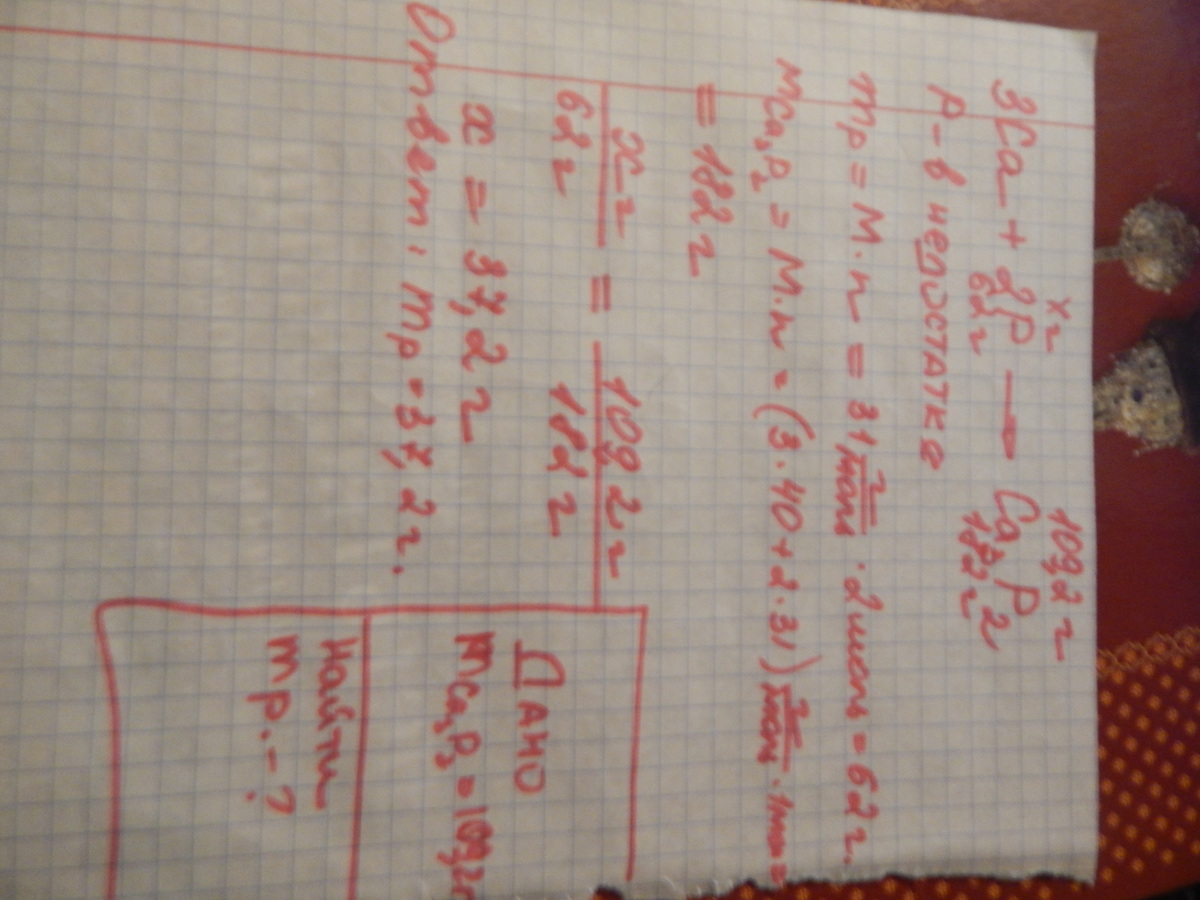 3Ca+2P=Ca3P2 m=2*31*109.2:182=37.2 г Ca3P2