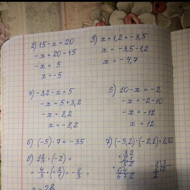2) 15-x=20; 3) x+1,2= -3,5; 4)-3,2-x=5; 5)10-x= -2