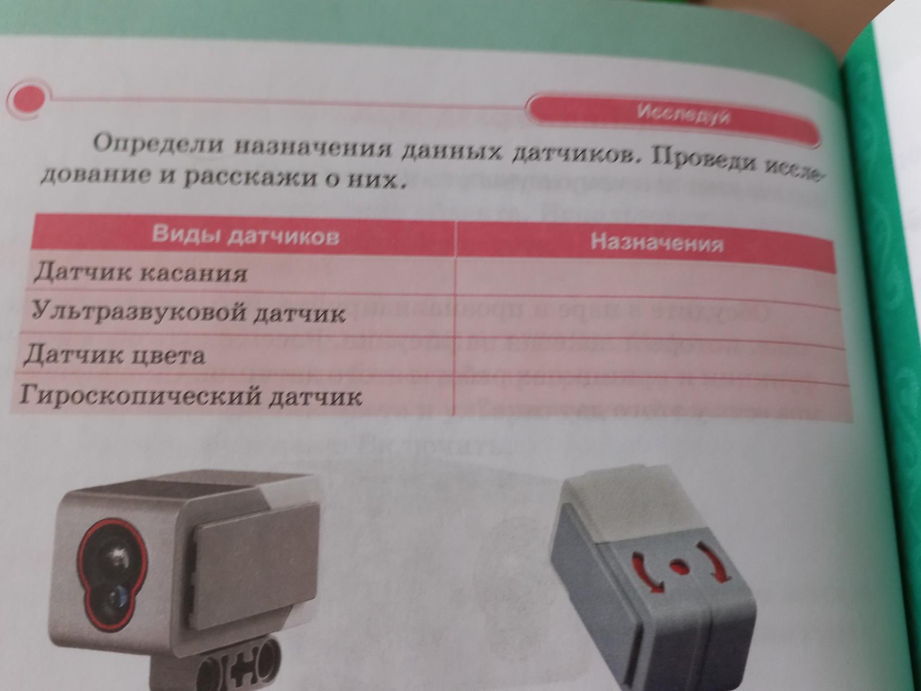 илодуй Определи назначения данных датчиков. Проведи исело дование и расскажи о них, Назначения Види датчиков Датчик касания Ултразвуковой датчик Датчик, Л,Ветя Гироскопический датчик