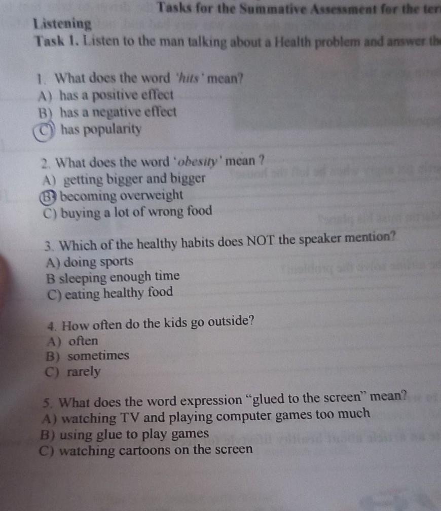 Tasks for the Summative Assessment for the term 3 Task 1. Listen to the man talking about a Health problem and answer the questions Listening 1. What does the word "hits' mean? A) has a positive effect B) has a negative effect has popularity a 2. What does the word obesity' mean? A) getting bigger and bigger B becoming overweight C) buying a lot of wrong food 3. Which of the healthy habits does NOT the speaker mention? A) doing sports B sleeping enough time C) eating healthy food 4. How often do the kids go outside? A) often B) sometimes C) rarely 5. What does the word expression "glued to the screen" mean? A) watching TV and playing computer games too much B) using glue to play games C) watching cartoons on the screen