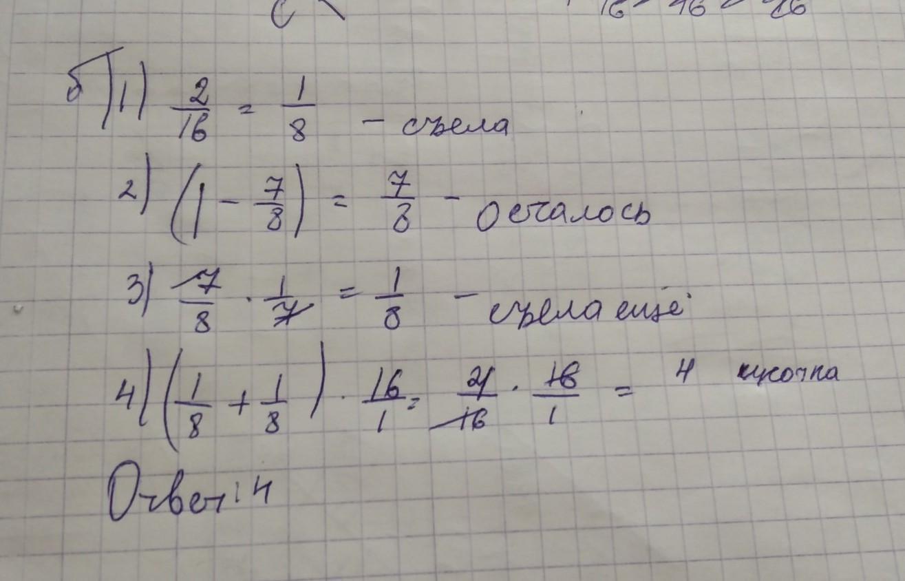 Шынар купила плитку шоколада,которая делится на 16 одинаковых кусочка.а) Шынар сьела 2 кусочка шоколада,какую часть она съела б) позже в этот же день она съела 1/7 часть от оставшегося шоколада, сколько всего кусочков она съела?