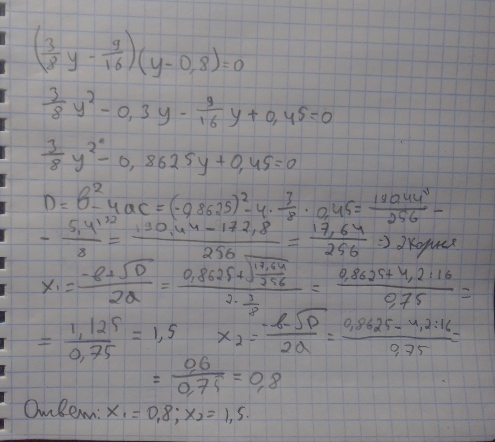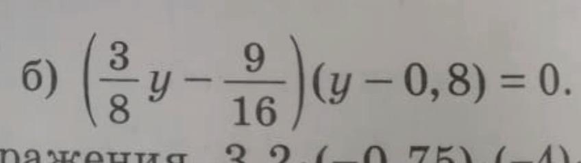 б) (3/8у - 9/16)(у - 0,8) = 0