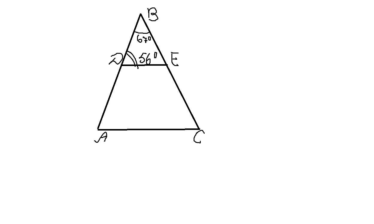 Нарисуй треугольник ABC и проведи DE || AC. Известно что D принадлежит AB, E принадлежит BC. угол ABC = 67 градусов, угол EDB = 56 градусов