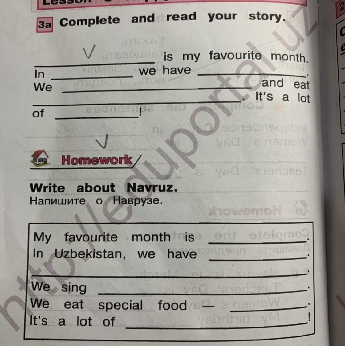 Homework My favourite month is January. In Uzbekistan, we have a lot of landscapes. We sing songs of different styles. We eat special food - Plov. It's a lot of nutritions there!