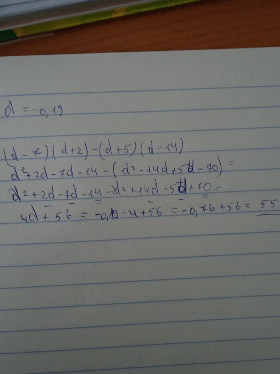 Найди значение выражения при d=-0,19,  Предварительно упростив его: (d-7)*(d+2)-(d+5)*(d-14)