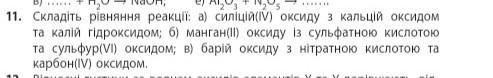 Ответ:а) силіцій (ІV) оксиду з кальцій оксидом та калій гідроксидом;SiO2 + CaO = CaSiO3SiO2 + 2KOH = K2SiO3 + H2O.(б) манган (ІІ) оксиду із сульфатною кислотою та сульфур (VІ) оксидом;MnO + H2SO4 = MnSO4 + H2O MnO + SO3 = MnSO4(в) барій оксиду з нітратною кислотою та карбон (ІV) оксидом.BaO + 2HNO3 = Ba(NO3)2 + H2O BaO + CO2 = BaCO3