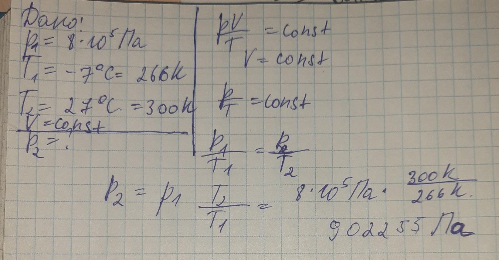 Углекислый газ в бутылке оказывает на пробку давление p=8*10^5 Па при температуре -7°С. Пробка вылетит, если бутылку нагреть до температуры 27°С. Каким будет давление, объём считать постоянным.
