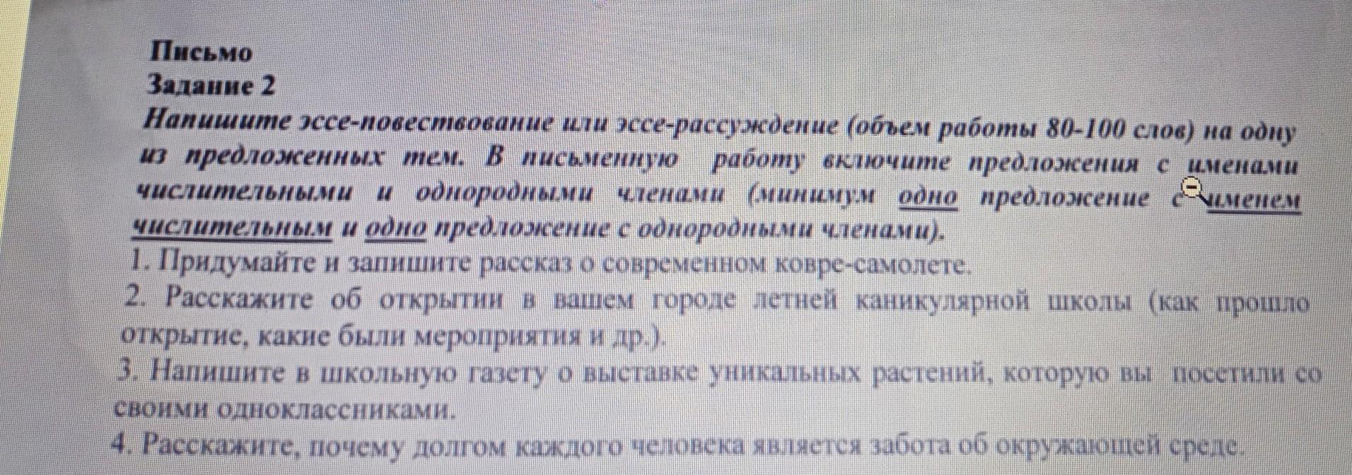 Письмо Задание 2 Налии и те кое-тоествование или эссе-рассуждение (объем работы 80-100 слов) на одну и предложенных тем. В письменную работу включите предложения с именами по числительными и однородными членами (минимум едно предложение с именем числительным и едно предложение с однородными членами).