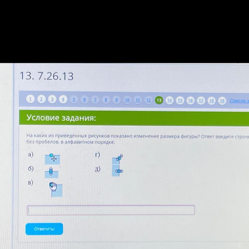 На каких из приведённых рисунков показано изменение размера фигуры? Ответ введите строчными буквами, без пробелов, в алфавитном порядке.