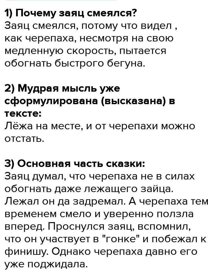 113. Прочитайте начало и конец сказки. Однажды Заяц и Черепаха поспорили, кто быстрее обежит лесную поляну. Черепаха пусти- лась в путь, а Заяц лежит под кустом, посмеи- вается: «Спеши, спеши, черепаха, всё равно тебя обгоню». Бегать-то он умел, но не знал того, что, лёжа на месте, и от Черепахи можно отстать, • Догадайтесь, почему Заяц смеялся. • Какая мудрая мысль высказана в заключительной части сказки? Придумайте основную часть сказки. Можно короткий вариант Основной части сказки