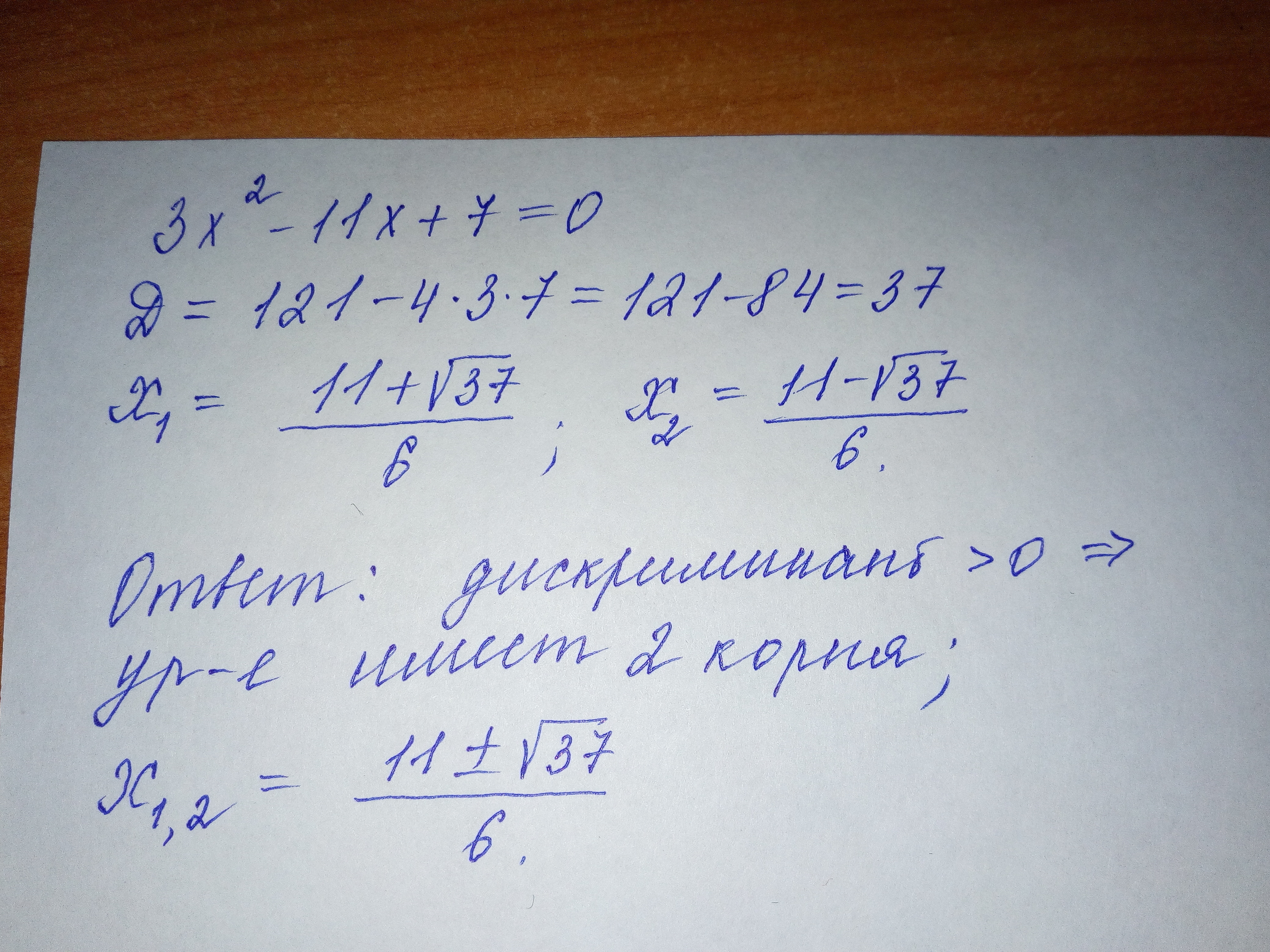 Определите имеет ли уравнение 3x^2-11x+7=0 корни , и если имеет , то сколько ?