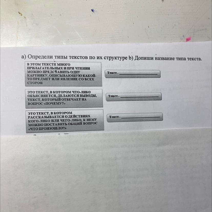 а) Определи типы текстов по их структуре b) Допиши название типа текста.