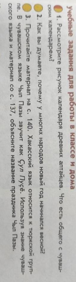 1. Рассмотрите рисунок календаря древних алтайцев. Что есть общего с чуваш- ским календарем? 2. Как вы думаете, почему у многих народов новый год начинался весной? 3. пе. В чувашском языке Чыл Пазы звучит как Ҫул Пуҫӗ. Используя знание чувашского языка и материал со с. 137, объясните название праздника Чыл Пазы.