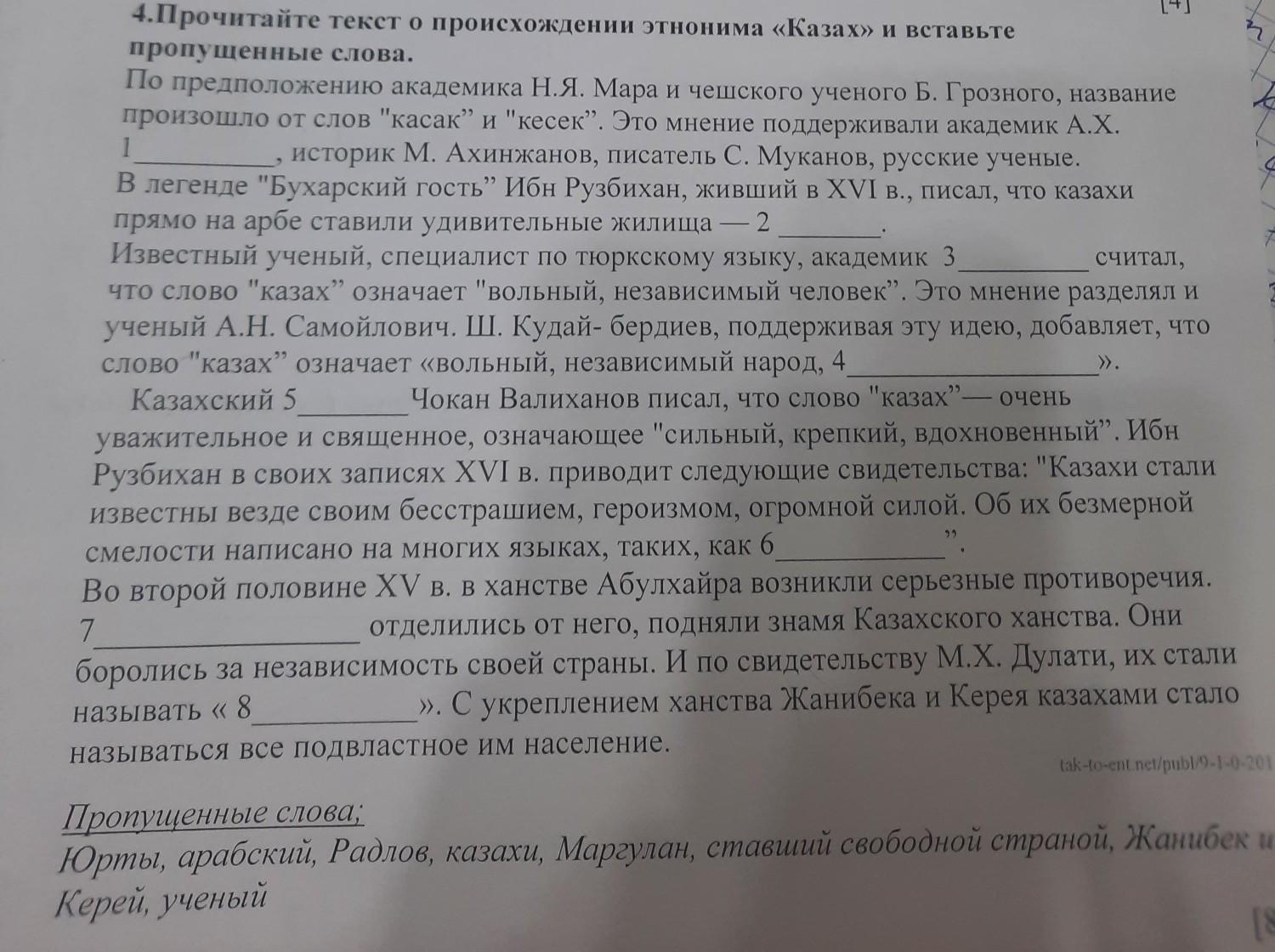 4.Прочитайте текст о происхождении этнонима «Казах» и вставьте пропущенные слова. По предположению академика Н.Я. Мара и чешского ученого Б. Грозного, на Шеше подлеживали академик СРОЧНО ПОМОГИТЕ ДАЮ 25 БАЛЛОВ!!!!!!