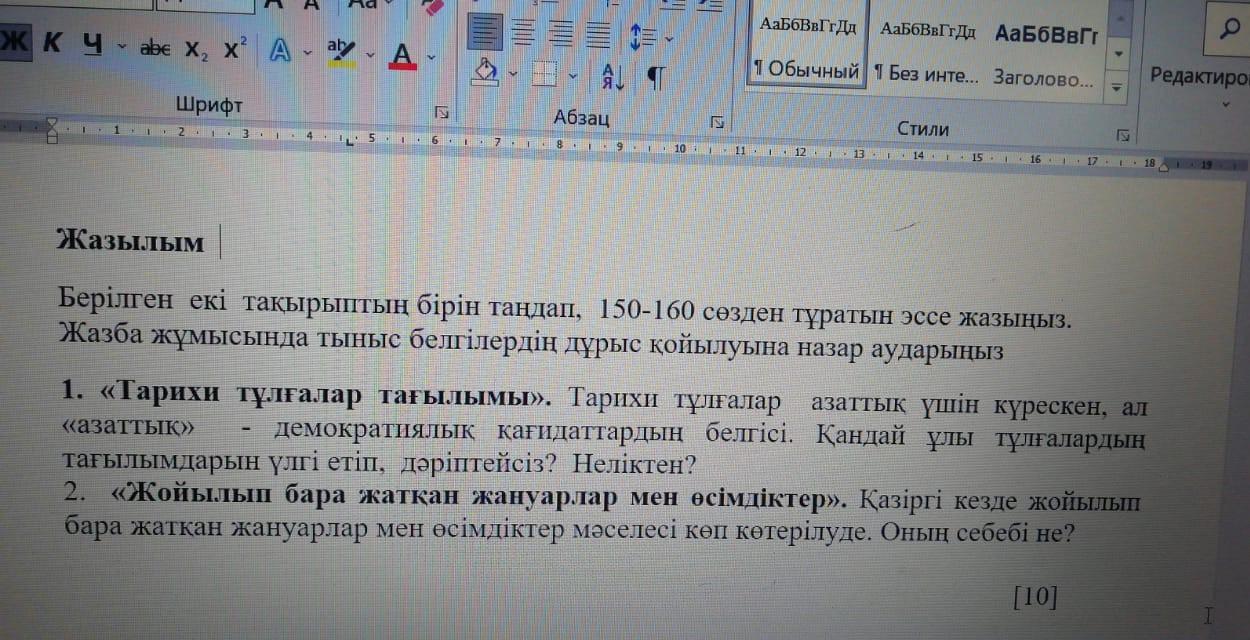 Жазылым Берілген екі тақырыптың бiрiн тандап , 150-160 сөзден тұратын эссе жазыныз Жазба жұмысында тыныс белгiлердiң дұрыс койылуына назар аударыңыз азаттық » 1. « Тарихи тұлғалар тағылымы » . Тарихи тұлғалар азаттык үшін күрескен , ал демократиялык қағидаттардын белгiсi . Қандай ұлы тұлғалардын тағылымдарын үлгі етіп , дәрiптейсіз ? Неліктен ? 2. « Жойылып бара жаткан жануарлар мен өсімдіктер » . Казiргi кезде жойылып бара жаткан жануарлар мен өсімдіктер мәселесі көп көтерілуде . Оның себебі не ? помогите пожалуйста срочно надо!!!!