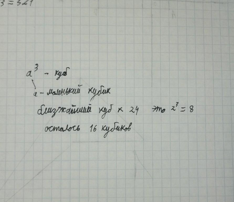 Было дано 24 кубика. Из них сложили один куб максимального размера, но остались лишние. Сколько кубиков осталось?