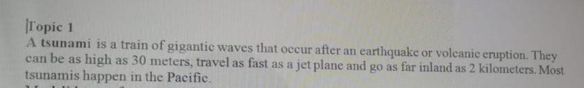Цунами- это ряд огромных волн, которые возникают после землетрясения или извержения вулкана. Они могут быть высотой 30метров, идти со скоростью самолёта и заходить на 2 км вглубь суши. Большинство цунами происходит в Тихом океане