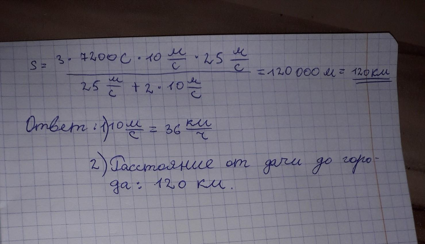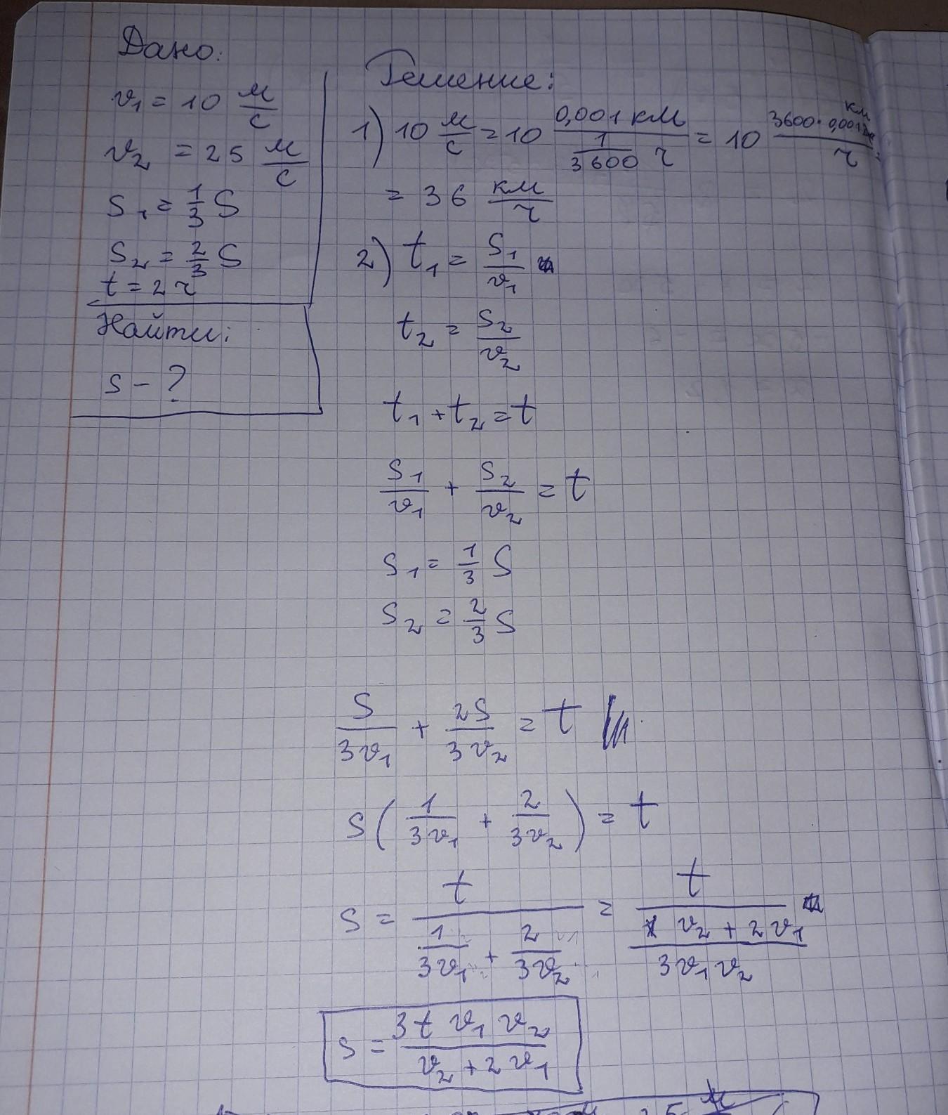 Возвращаясь с дачи в город, автомобилист ехал треть пути по грунтовой дороге со скоростью 10 м/с, а оставшуюся часть пути — по шоссе со скоростью 25 м/с. 1) Выразите скорость автомобилиста на первом участке движения в км/ч. 2) Определите расстояние от дачи до города, если весь путь от дачи до города автомобилист проехал за 2ч. (ПОМОГИТЕ ПОЖАЛУЙСТА) :
