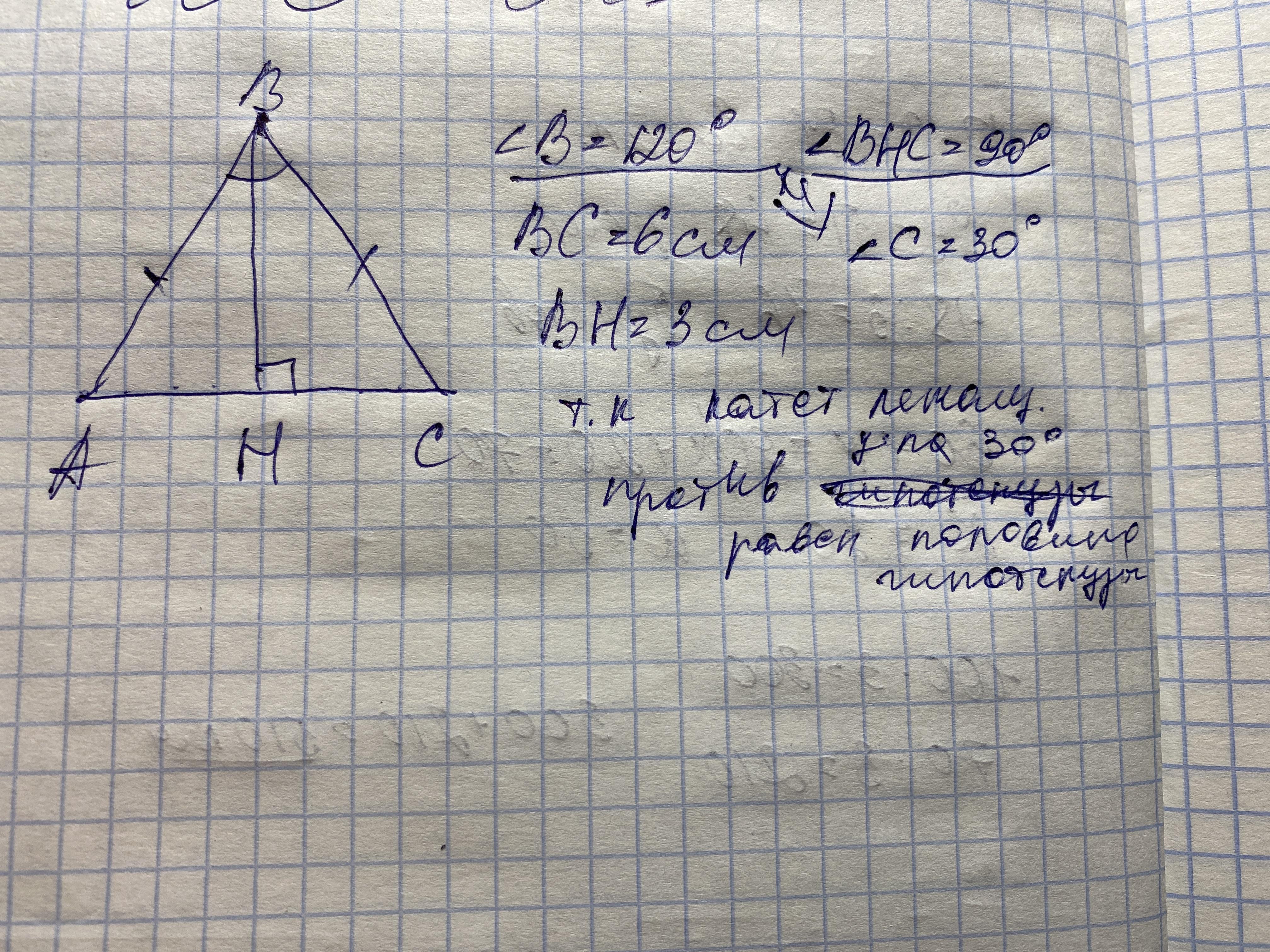 Дан равнобедренный треугольник ABC с основанием АС проведена биссектриса ВН. Найти ВН если угол В=120градусов, ВС=6см