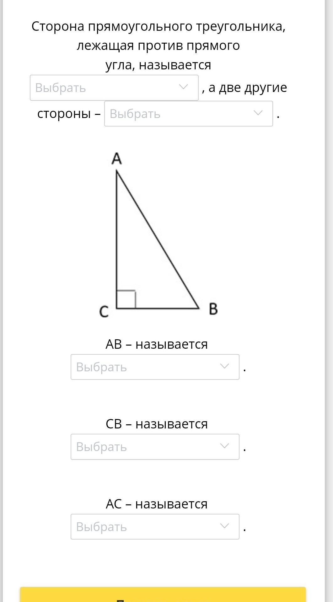 Сторона прямоугольного треугольника, лежащая против прямого угла, называется ГИПОТЕНУЗА, а две другие стороны КАТЕТ(-Ы).