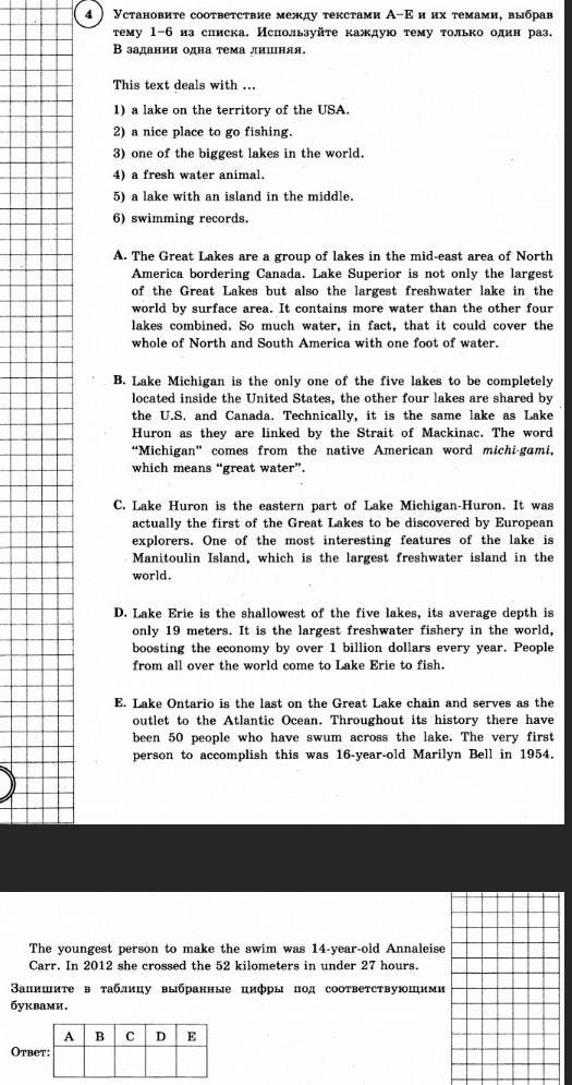 Правильные ответы: A)-3(one of the biggest lakes in the world)B)-1(a lake on the territory of the USA)C)-5(a lake with an Island in the middle)D)-2(a nice place to go fishing)E)-6(swimming records)Итог: лишняя тема четвёртая