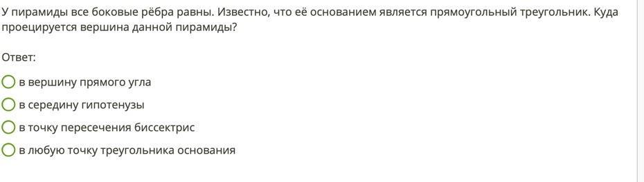 вершина пирамиды проецируется в середину гипотенузы, поскольку тогда и проекции наклонных - боковых ребер тоже должны быть равными, а это достигается, когда из вершины прямого угла опустить медиану к гипотенузе. она и будет являться радиусом описанной окружности, и равна половине гипотенузы.