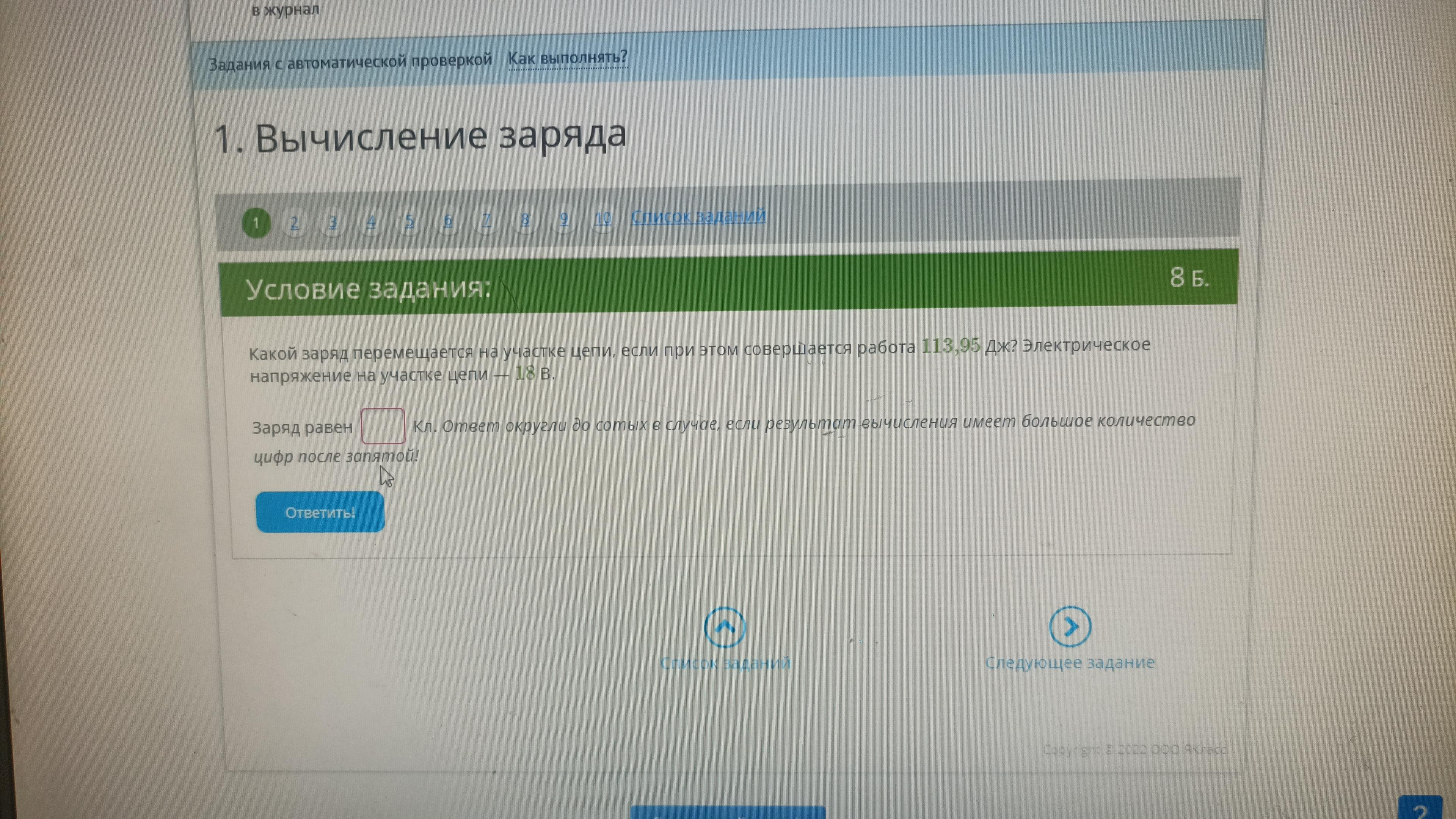 q=A/U=113,95/18=6,33 Кл
