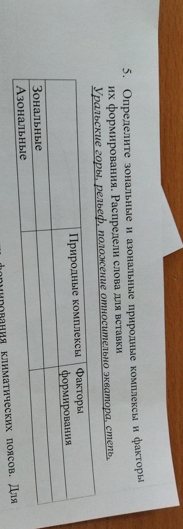 5. Определите зональные и азональные природные комплексы и факторы их формирования. Распредели слова для вставки Уральские горы, рельеф, положение относительно экватора, степь, Природные комплексы Факторы формирования Зональные Азональные