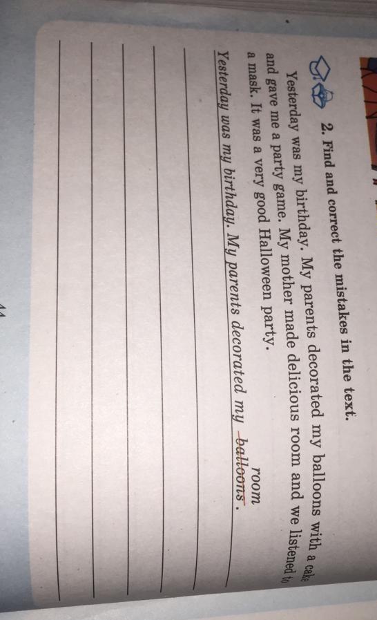 Yesterday was my birthday. My parents decorated my room with a balloons and gave me a party mask. My mother made delicious cake and we playing(?) to a game. It was a very good Birthday party.