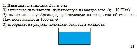 5. Даны два тела массами 2 кг и 6 кг 1) вычислите силу тяжести, действующую на каждое тело (g = 10 Н/кг) 2) вычислите силу Архимеда действующую на тела, если объемы тел одинаковы и равны 0,005м³. Плотность жидкости 1000 кг/м3 3) изобразите на рисунке положение этих тел в жидкости