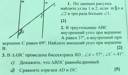 2. В треугольнике АВС внутренний угол при вершине А равен 37°, а внутренний при вершине С равен 69. Найдите внешний угол при вершине B.