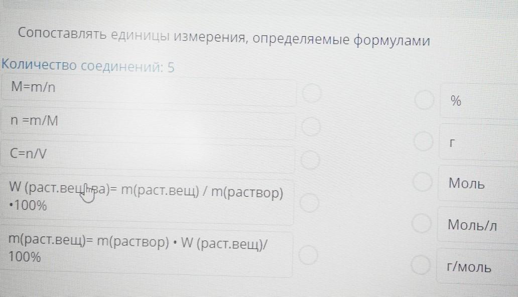 Сопоставлять единицы измерения, определяемые формулами Количество соединений: 5 M=m/n 0% n =m/M C=n/у Моль W (раст. вецера) = m(раст. вещ) / m(раствор) • 100% Моль/л m(раст.вещ) = m(раствор) • W (раст.вещ)/ 100% г/моль