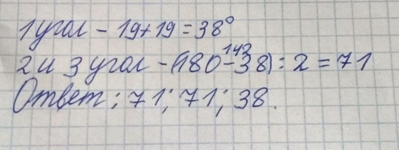 Угол между основанием равнобедренного треугольника и высотой, проведённой к боковой стороне, равен 19°. Найдите углы данного треугольника.