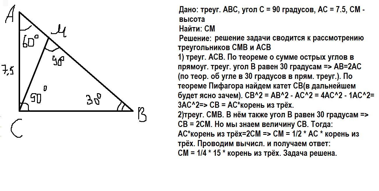 в треугольнике авс известно что угол А=60⁰ угол С=90⁰ ас=7,5см и проведена высота см найдите длину высоты см