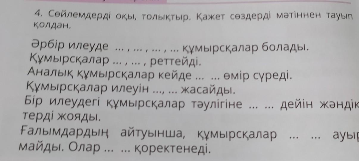 Оқиық және жауап берейік 4. Сөйлемдерді оқы, толықтыр. Қажет сөздерді мәтіннен тауып қолдан. Әрбір илеуде ... , ... , ... , құмырсқалар болады. Құмырсқалар ... , ... , реттейді. Аналық құмырсқалар кейде ... ... өмір сүреді. Құмырсқалар илеуін жасайды. Бір илеудегі құмырсқалар тәулігіне ... ... дейін жәндік- терді жояды. Ғалымдардың айтуынша, құмырсқалар ауыр- майды. Олар ... ... қоректенеді. Жазайык •••••• ... ...