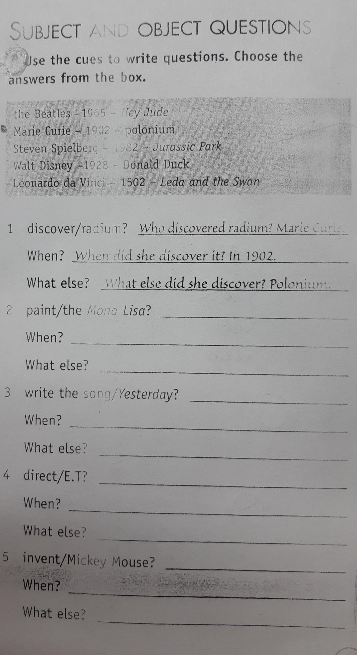 What else did he paint? Leda and the Swan. 3. Who wrote the song Yesterday? the Beatles When did they write the song? In 1965. What else did they write? They wrote Hey Jude. 4. Who directed I.T? Steven Spielberg. When did he direct it? In 1982. What else did he direct? Jurassic Park