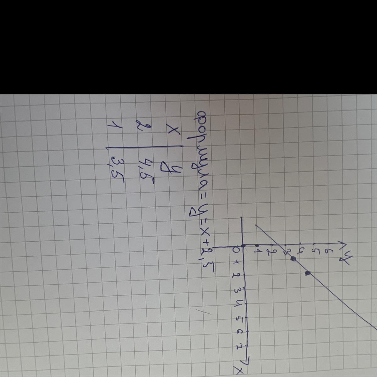 под x мы берём любое число, первое число я взяла 2,через формулу получилось что y=4,5, второе число под x я взяла 1, по формуле получилось что y=3,5. после этого просто построила график, поставила точки и провела линию через эти точки