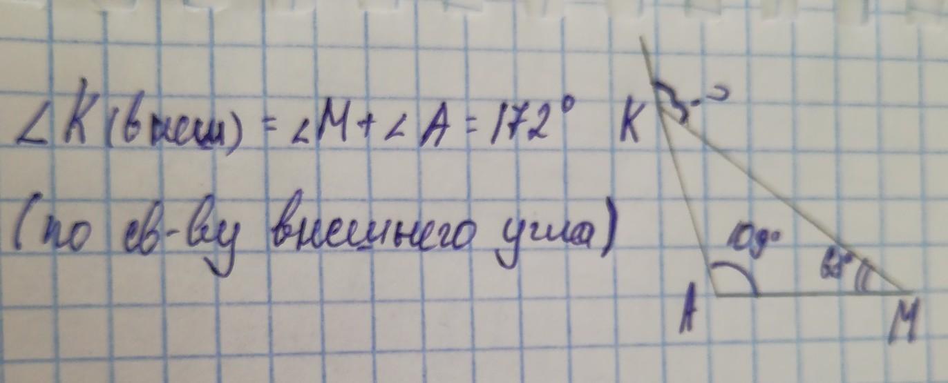 2. В треугольнике АКМ внешний угол при вершине А равен 109“, а внутренний при вершине M равен 63 °. Найдите внешний угол при вершине К